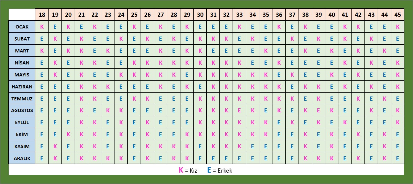 Grafiğin ilk satırında annenin yaşı verilmiştir. Burada annenin yaşını işaretleyin. Grafik üzerinde anne yaşını işaretlediğiniz yerden aşağıya doğru inin. Eğer erkek isteniyorsa, “E” işaretinin solundaki ay sütununa bakılarak, hamile kalınması gereken ay saptanır. Eğer kız isteniyorsa bu kez “K” işaretinin solundaki aylar sütunundan hamile kalınacak ay bulunur. Listenin doğruluğu, halen mevcut olan çocukların ve annenin yaşı ile çocuğun doğum tarihinden 9 ay öncesine gidilip hami kalınan ayı bularak saptanabilir. Burada annenin yaşının doğru tespiti önemli. Yani önce annenin hamile kaldığı yaşı bulup, hangi ayda hamile kaldığını işaretleyip, 9 ay ileri giderek, doğacak çocuğun kız mı erkek mi olacağını öğrenebilirsiniz.